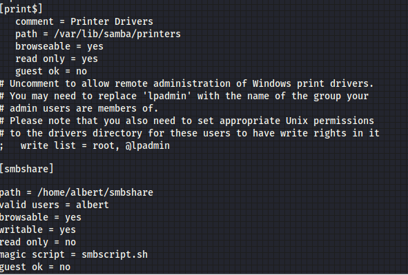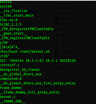 El segundo es un archivo binario, veamos su interior de manera sencilla para no ejecutarlo (por seguridad xD), encontramos un setuid y un /bin/bash /root/beroot.sh, al parecer ese binario ejecuta un archivo llamado beroot.shb, pero no solo eso, el siguiente archivo dentro de la carpeta smbshare se encuentra un conf, al abrirlo se ve otro dato interesante en magic script, que se puede ejecutar un bash.