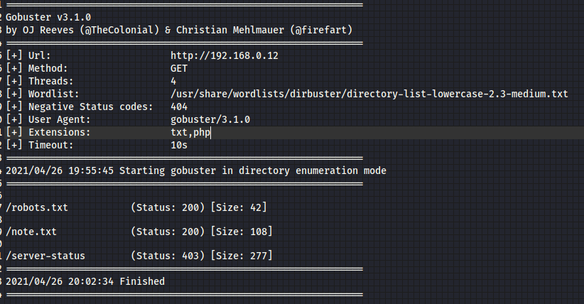En gobuster encontramos 2 links, uno de robots.txt y otro de note.txt.