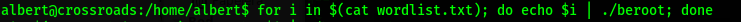 Son muchas las palabras para intentar, así que haré algo que siempre uso en un bash cuando quiero eliminar los ssh. Pero esta vez será para probar contraseñas en la aplicación beroot y será con un for.
