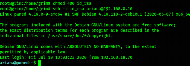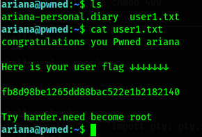 Al entrar encontramos un id_rsa que habra que darle permisos chmod 400 y un archivo de texto, donde hay un mensaje para una tal ariana, con eso ya tenemos una contraseña y un usuario.