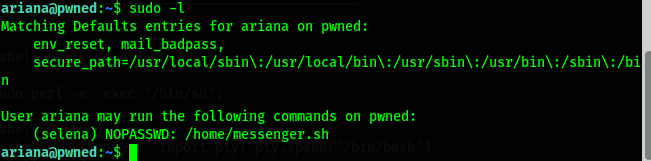 Buscamos algo que tenga permisos root, lo básico, sudo -l y no da un mensaje de que selene tiene permisos para ejecutar un bash.