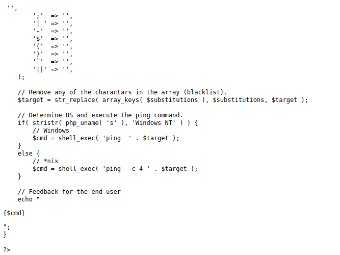 Sin embargo no hay acceso, se puede intentar con nc o nc.traditional, o algun bash, pero no hubo suerte de hacer alguna conexión remota, así que veamos el archivo out.php, y nos muestra la razón de porque no se puede hacer nada más que ejecutar algunos comandos.