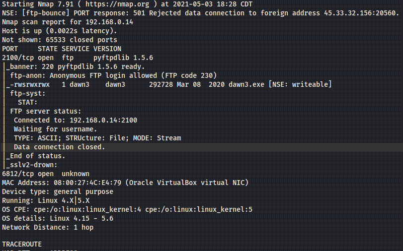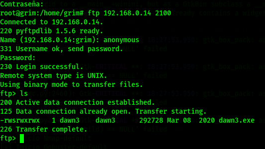 Nmap nos muestra una entrada a ftp y otro a un puerto desconocido.