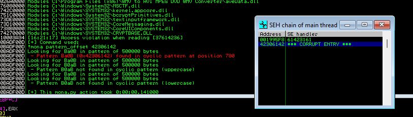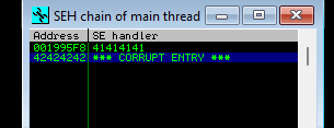 Hagamos un pattern de 1000 bytes y oprimamos alt + S para ver la ventana de SEH y veamos como se vulnera la app.