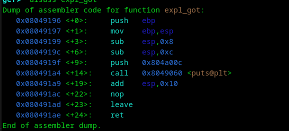 El objetivo aquí es llegar a cierta zona, en este caso tenemos que activar la función expl_got(), para esto necesitamos la ayuda de un jmp y las librerías tienen esos jmp que necesitamos, y para eso utilizaremos GOT.