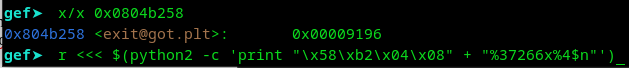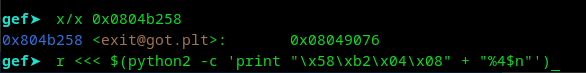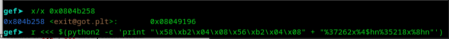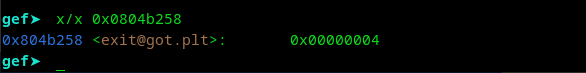 Podemos ver que exit() es una posibilidad y está en la dirección 0x0804b258, vamos a buscarla con GDB, ¿y porqué exit()?, porque no podemos sobrescribir lo que necesitamos como puts o printf, que es lo que no ayudará a meter la dirección ni tampoco gets, porque ahí es donde escribiremos la dirección, lo mejor es exit().