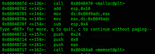 Al parecer malloc abre un espacio en memoría, después lo llena de ceros com memset, si lo verificamos en el código de arriba, podemos ver que en efecto, eso hace, pero además analiza la longitud y verifica que sea menos de 31, después mete en la estructura lo que fgets recibio y aumentan en 5 para eliminar auth y solo guardar la información recibida.