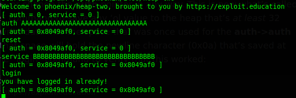 Como pueden observar, reset usa free, el cual no borra de memoría los datos inmediatamente, los guarda en la pila para liberar el espacio, por esa razón, cuando observamos el debuger, la comparativa de la cantidad de bytes más el ultimo byte que es un 0x0000000a es igual a los nuevos datos que metimos después, y en está ocasión la vulnerabilidad está en que la comparativa detecta los nuevos datos con los que free guardó en memoría y por esa razón nos da acceso