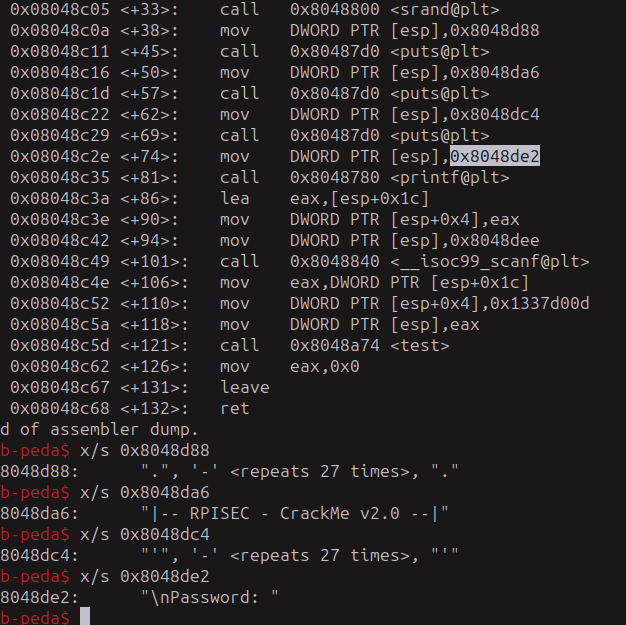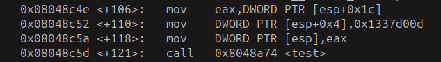 Perfecto, ahora podemos observar que antes de llamar a la función test, le manda datos, podemos ver como mete en "eax" los datos que le dimos, en este caso serán numeros, después lo coloca en esp junto con otro que es 0x1337d00d.
