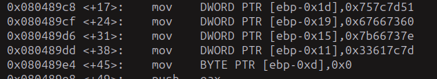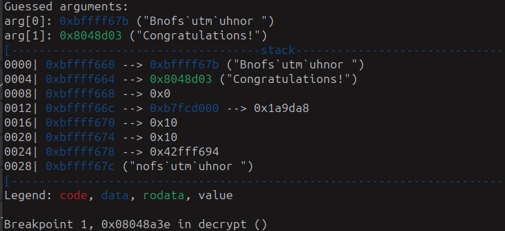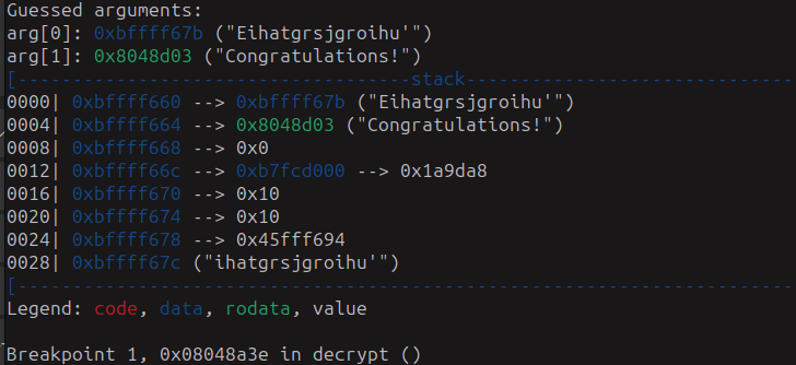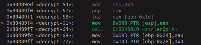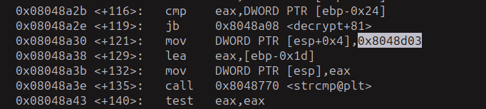 Esto que vemos es importante, porque guarda los datos que les dimos en los registros eax y edx, luego hace una resta del integer que le dimos a 0x1337d00d, lo guarda en ebp-0xc y luego lo compara con 0x15 y salta a la etiqueta 0x8048bd5 si es mayor y no queremos que eso pase, queremos que continué hasta la función decrypt.