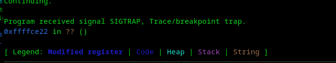 Listo, conseguimos SIGTRAP que sería la señal de interrupción, sin embargo, hay un detalle importante, podemos ver como no parece ser el inicio, así que bajemos los bytes.