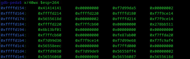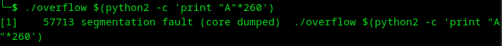 Nota: Puede cambiar en ciertas ocasiones, por ejemplo, en otro sistema linux el resultado cambio, a diferencia del anterior que se usaron 264 + 4 byte para RET, aquí solo se necesitaron 260 + 4 bytes para RET