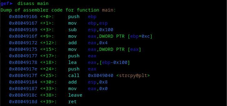 Vemos como se genera un strcpy() al abrir un espacio de 256 (0x100), y luego copia ese bloque en otro nuevo.