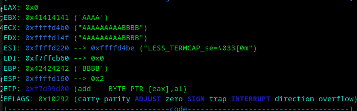 Vemos que se produce un overflow en $ebp, pero no sobreescribe EIP que es un puntero a la siguiente instrucción.
