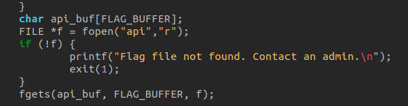 Analizamos el código para encontrar algo que pueda hacerlo inseguro, pero no hay algo que pueda dar una pista hasta que vemos un read que lee un archivo llamado api pero no hace nada. Lo que significa que el código esta en memoria, así que revisemos con "%x" para analizar los registros guardados.