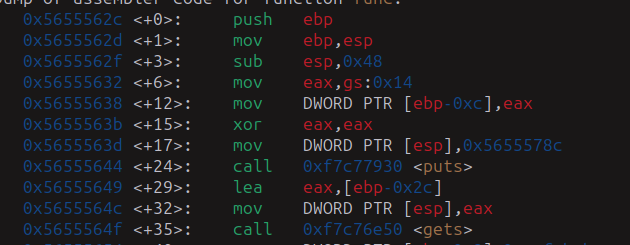 Se puede observar que gets ocupa 44 bytes, pero en el código menciona que son 32, y es cierto, son 32 bytes, porque al inicio podemos observa como se toma de ebp-0xc = 12 decimal y en gets 0x2c = 44 si hacemos la operacion serian 2c-c = (0x20 - 32 decimal).
