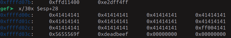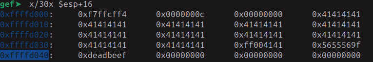 observemos el buffer, 0xffffd040 (0xdeadbeef) - 0xffffd00c (0x41414141) = 0x34 -> 52 decimal