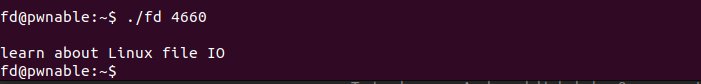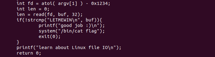 Vemos que el código menciona que fd recibe un argumento, lo convierte en integer y le resta 0x1234, si al abrir el archivo si encuentra en los leído "LETMEWIN", obtenemos un bash con el contenido de flag.