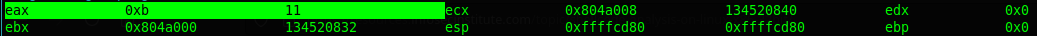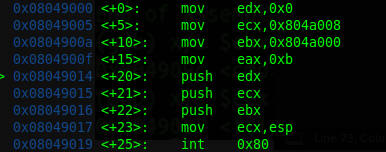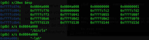Lo demás es la repetición de la primera parte del anterior ejemplo, pero esta vez metemos en la pila '/bin/ls', en hexadecimales, y metemos eso en ebx, al final queda igual.