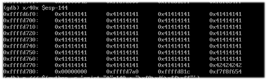 Al parecer se logró, pero hay que ver donde inicia, ya que de ahí en adelante tenemos espacio libre para meter la shell, el espacio no es ilimitado, solo es la capacidad del buffer que se logró sobreescribir. Recuerda que había un espacio de 136, pero si quitamos ebp y ret, da 128, observa el código y obtendremos un char buffer[128].