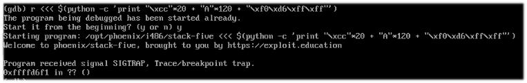 Bien, usemos un metodo de "\xcc", que produce un SIGTRAP, que aparece cuando una ejecución cambia y el sistema lo detiene. Para lograr esto, puedes tomar unos bytes de los 140 que sobreescriben la pila, puedes hacer un calculo como haciendo un slide o simplemente tomar unos cuantos, en está ocasión solo tomaré 20 bytes