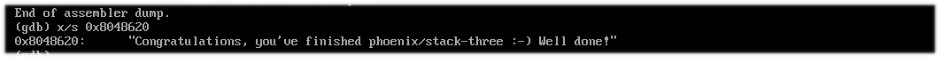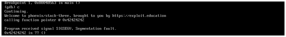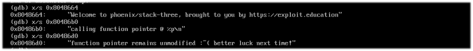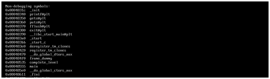 Podemos observar como logramos sobreescribir el buffer y return, pero no nos aparece nada sobre como pasar el objetivo, así que hagamosle caso a calling function pointer y busquemos con info function las funciones que utiliza, tambien se puede utilizar objdump, pero ahora no será necesario, con GDB tenemos para esta prueba.