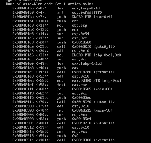 Los dos ultimos puts tienen cadena de caracteres, y el primero es el que nos interesa, hace un push en la pila (0x80485ac) e invoca un call a puts seguido de un jmp para llegar a exit y terminar el programa.
