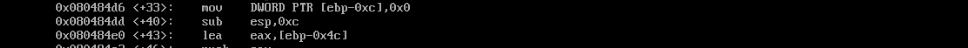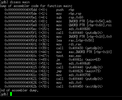 Hay que tener en cuenta algo, si observan, en la base (EBP) se encuentra [ebp-0xc], 0x0 y luego se encuentra un lea eax,[ebp-0x4c] que es un espacio para gets, entonces 0x4c - 0xc = 40hex o (64 decimal).