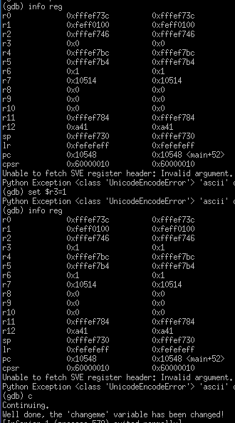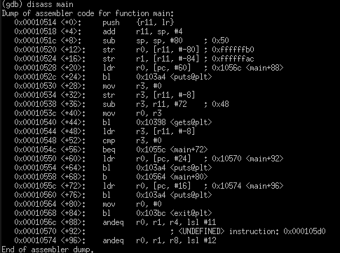 El puts que nos interesa es (0x10570) y para poder llegar tenemos que lograr que r3 se sobreescriba para que beq no salte a (0x10574) y terminar el programa.