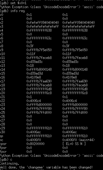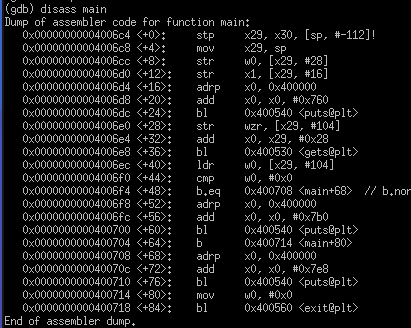 El puts que nos interesa es (0x7b0) y para poder llegar tenemos que lograr que w0 se sobreescriba para que b.eq no salte a (0x400708) y terminar el programa.