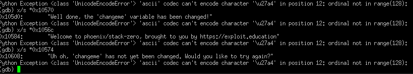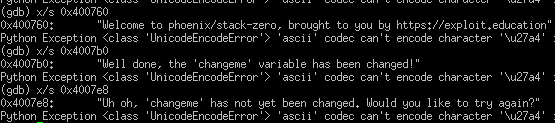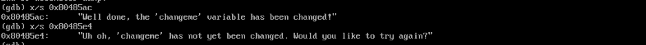 También podemos obervar que para llegar a esa dirección, gets mete a eax algunos bytes cuando escibimos el mensaje que nos pide, pero justo después mete en eax un 0x0, que anteriormente se guardo en [ebp-0xc],0x0... lo que significa que el primer push mete a la pila bytes, después pone a eax en 0 y al hacer la comparación siempre será negativa la respuesta 1 != 0.