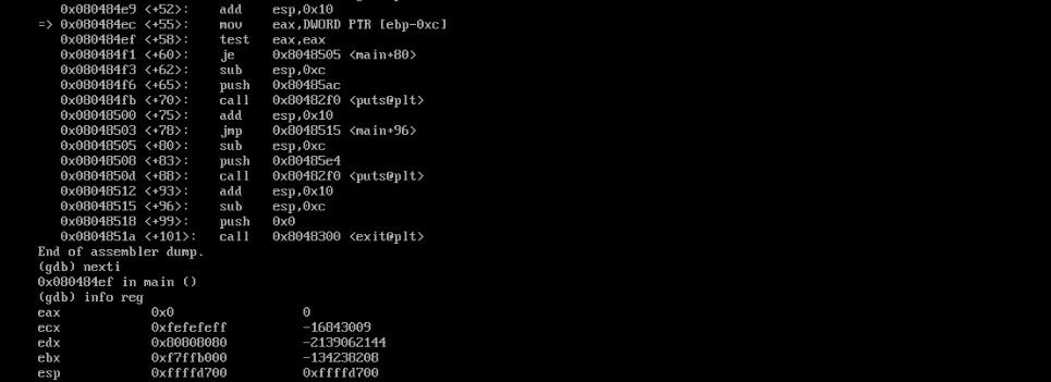 El puts que nos interesa es (0x4006d0) y para poder llegar tenemos que lograr que eax se sobreescriba para que je no salte a (0x400708) y terminar el programa.