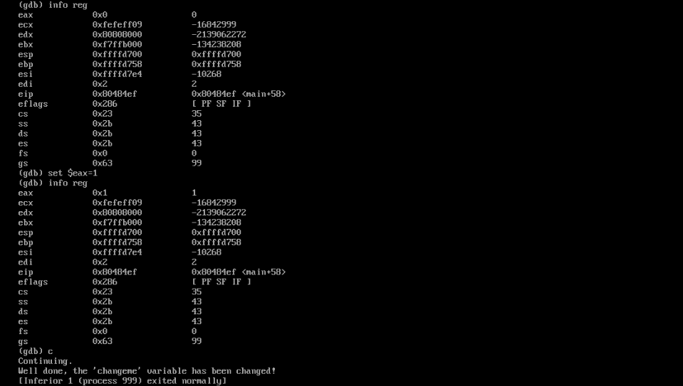 ¿Y qué pasa si modificamos a eax antes de que haga la comparación y le ponemos 1?.