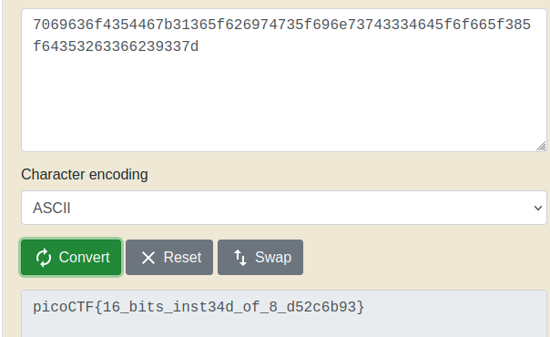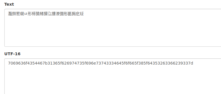 Al intentar decodificarlo no hubo un buen resultado hasta que por error lo codifiqué con utf16 y me apareció un grupo de hexadecimales, se me ocurrió convertirlos en ascii