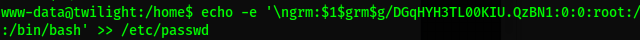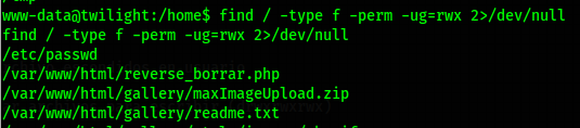 Perfecto, pudimos entrar, ahí metemos una shell para lograr una conexión remota. Desafortunadamente no hay nada que pueda elevar privilegios, hasta que buscamos los archivo con permisos de escritura y es "/etc/passwd"