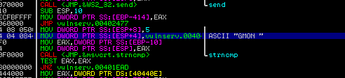 Podemos ver en la imagen la API strncmp, "int strncmp(const char *str1, const char *str2, size_t n)", en otras palabras, está comparando "strcmp("GMON ", "GMON ", 5)", el espacio al final también cuenta
