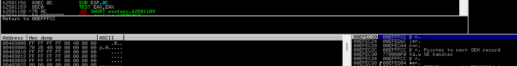 Perfecto, llegamos al lugar donde colocamos el break y además podemos ver en la segunda imagen como RETN apunta a 00EFFFCC que es el mismo de Pointer to next SEH record.
