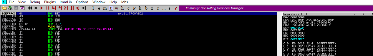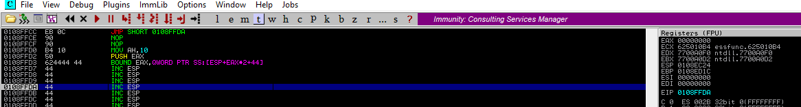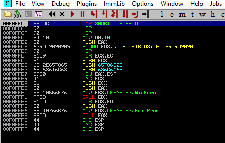 Listo, logramos el objetivo, ahora, ¿porqué dejamos unos cuantos y no colocamos el jmp en el incio de los 44's?, sencillo, evitamos problemas a la hora de ejecutar una shell, el conocido NOP_slide.